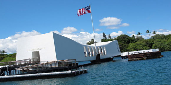 并遠觀港中央憑吊被日軍炸沉的亞利桑那號戰艦遺骸。