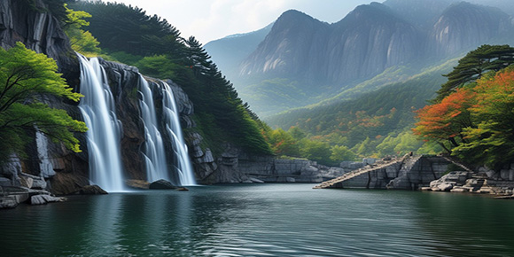 千秋--【黃龍?zhí)丁俊ⅰ緸觚執(zhí)丁浚執(zhí)队纳睢㈧o謐,古木掩映的峽谷間,一道溪澗穿繞石壘而下,銀色瀑布沖擊
