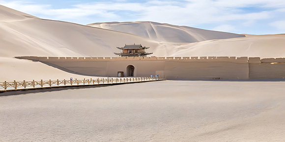 敦煌 早餐后乘車赴敦煌瓜州(260KM、約 3 小時),帶您掀開【大地之子】(游覽約 15 分鐘)的面紗,在這里尋找你的初心。蒼茫的大地 上俯臥著一個神情安詳的嬰兒,他仿佛正在大地媽媽的懷抱里安然入睡。這萬古深情這戈壁蒼穹揮映著古往今來的真誠。大地之子孕 育著多少人的心聲!有一座【海市蜃樓】(游覽約 15 分鐘)主體雕塑是由一個“主殿 ”和四個“闕樓 ”構成。原來它是由清華美院董 書兵教授在甘肅省瓜州縣創作的第二件大型作品,名曰《無界》,在這戈壁荒漠中,實屬一處難得的景致。后參觀【漢武帝雕塑】(游覽約 15 分鐘)位于瓜州縣榆林大道,雕塑塑造了漢武帝的光輝形象,也將具體的歷史人物和地域文化、以及特定事件緊密的聯系在了 一起,作品風格遠承漢唐之雄偉氣韻,質樸無華的美學追求與蒼茫的戈壁相統一。后赴敦煌多情【鳴沙山.月牙泉】(游覽約 2 小時): 相信夢里到達的地方,總有一天腳步也能到達。月牙泉處于鳴沙山環抱之中,其形酷似一彎新月。古稱沙井,又名藥泉,就這一汪清 泉臥荒漠, 日月蒸騰,千年,風沙彌漫,依然鮮活。泉水清澈,一如明亮的眸子,在渾黃的狂風和滾滾的黃沙飛揚中,與日月同輝。 贈送項目體驗--穿漢服、宇航服、沙漠大禮包(ATV 的體驗、滑沙、蕩橋、海盜船體驗),后入住酒店。