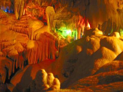 經過我們共同努力,走上了大廳的最高點,不知大家發現沒有,我們的視野一下子就開闊了許多,那在99年的時候,一位地質專家到這兒,他發現,這個大廳的景觀非常像我們的母親河黃河沿岸風景的縮影。他說現在我們所站的位置非常像黃河的流經地黃土高原,而我們對面的景觀像黃河的發源地現代冰川。去過黃土高原的人們就真地找到熟悉的感覺,不信大家看,這里有褐黃色的地表,隴起的丘埂,一層層梯田,就像等著農民來播種似的。這種酷似梯田的巖溶現象學名叫石梯田,梯田里有水下結晶體,顆粒狀的穴珠是由停滯水沉積形成,再看一下景觀給人感覺就像一道金色瀑布飛流直下,在河面上激起一道道波紋,這波紋是石頭的學名叫邊石坎,也叫邊石壩。站在這里看它像金色瀑布,當我們站在不同位置看它的時候,感覺可就完全不同了,接下來我們到下邊平臺再看一下。