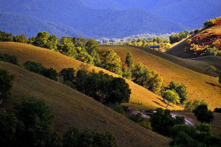 四是樺林景觀。最鮮明的特征是疏密相間,疏可馳馬,密不通風。草甸邊緣的漫坡,有的地段長滿了樺樹,大片的樺林密不通風。鉆進去,枝葉遮云蔽日,不知道林子有多大。有的地段樺樹稀稀疏疏,有單棵的,有三五一簇的,有幾十棵成叢的,美不勝收。加上這里的地形富于變化,有草場,有濕地,有峽谷,有山丘。早晚太陽斜照,逆光將一道道山梁打出了高光輪廓線,明暗反差渲染了大環境的朦朧美,構成了一幅幅古