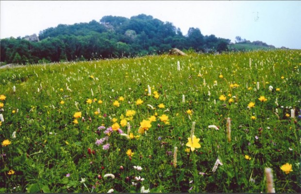 村民說,若是七月初至八月中旬,草甸上的野花更加茂盛。這山頂上的花不知道開過了多少年,更不知道是誰發現了這峰頂的百花奇艷,因而成就了這百花山的山名。多少年的花開花落,多少年的默默無聞,如山下的村民一樣淳樸自然,靜謐地享受著生活。漫步在草甸里,吸著那草地里的清香,吻著草尖,感覺自己已經消融在這芬芳的草地里。草甸中突出數十塊巨石,與鮮花映襯,一剛一柔,分外漂亮。