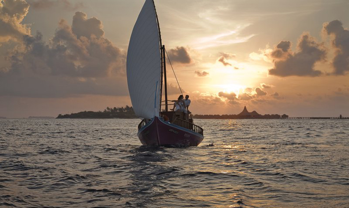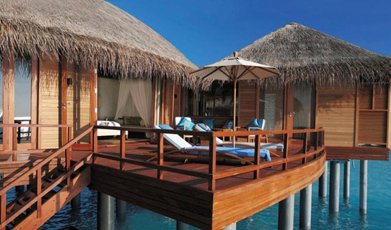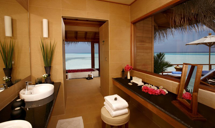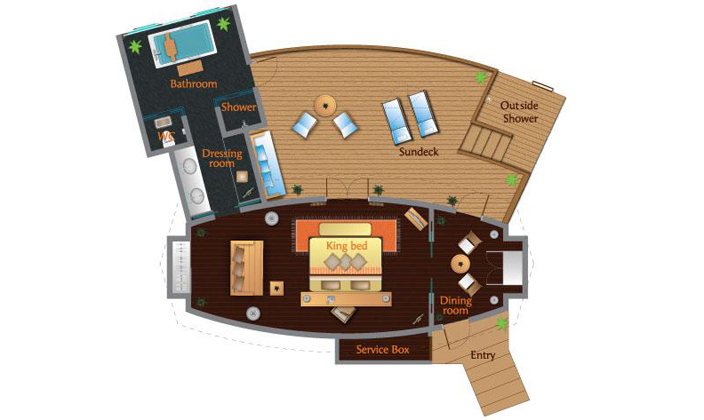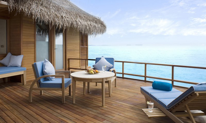 日落水上套房可欣賞迷人的日落。 每天在您配有躺椅和餐桌的私人日光甲板上欣賞這一美景。在小屋之下的碧藍(lán)海水中暢游,或是透過浴室地板的玻璃觀景窗,欣賞印度洋各種海洋生物在您的私人靜居之下悠然游弋。 浸入超大浴缸,聽著最愛的MP3音樂,欣賞迷人的瀉湖美景。