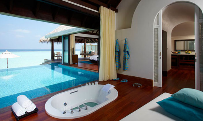 水上泳池別墅建在水上。 房間寬敞明亮,灑滿了五顏六色的鮮花,散發(fā)著陣陣的熱帶清香。 蓋著埃及棉布,枕著個(gè)性化的枕頭,酣然入夢(mèng)。由條紋木材搭成,配有挑高的天花板和硬木地板。 這些超大別墅配有男女獨(dú)立步入式衣柜、冰酒器、私人泳池和陽(yáng)光甲板,可以俯瞰一望無(wú)際的大海,營(yíng)造一種無(wú)與倫比的水上豪華體驗(yàn)。 259平方米的寬敞空間,讓您感覺(jué)仿佛與大海連成一體。