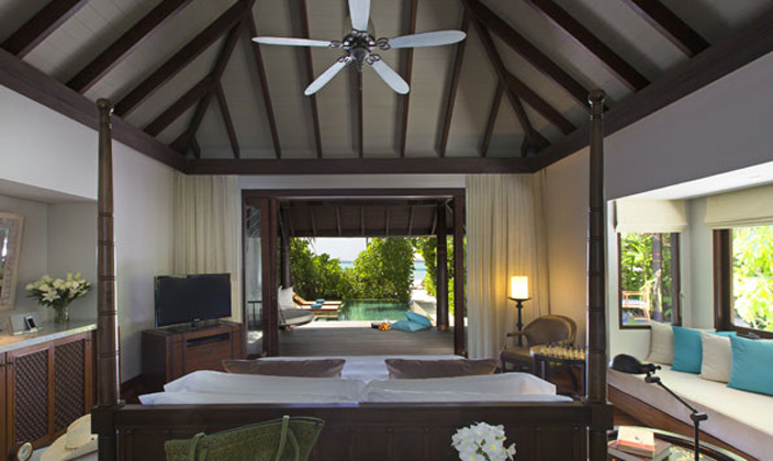 別墅主臥室擁有豪華的特大雙人床,浴室設(shè)有室內(nèi)和戶外沐浴,以及嵌入淺水池中的露天浴缸。第二間臥室擁有兩張單人床和一張沙發(fā)床,相連的第二間浴室設(shè)有半室內(nèi)和戶外淋浴。兩間臥室皆通往寬敞的日光甲板,一家人可以在躺椅上休憩,在四面敞開的用餐亭中共享美食,或是在延展至白色柔軟沙灘的大型無(wú)邊泳池玩耍。