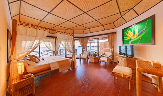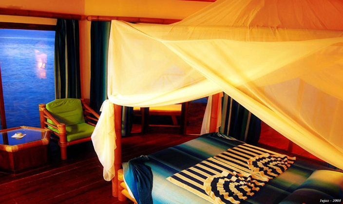 獨立的水上屋有足夠大的私人陽臺,竹制的家具,木制地板給人奢華的外觀及奢華的感受,水上屋提供咖啡機(jī)和茶具,衛(wèi)生間帶有浴缸。 水上屋三面玻璃,打開簾子就享受外面的風(fēng)景無敵,打開屋內(nèi)的茶幾玻璃可以直接喂魚,在浴室的浴缸洗澡,打開朝向水臺的門可欣賞無敵海景。