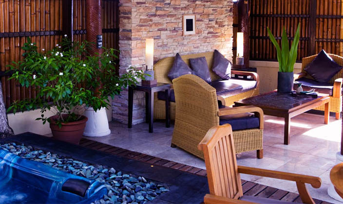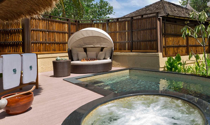 豪華觀海別墅讓您在私人花園和涼亭中安靜地享受私人按摩池和室外淋浴。豪華大花園110 平米的大空間,同時給您充分的隱私和蔭涼。透過樹葉可以看到誘惑的海灘,激發您曬日光浴的欲望;除了室外按摩池,還有室外淋浴設備,讓您更接近自然。