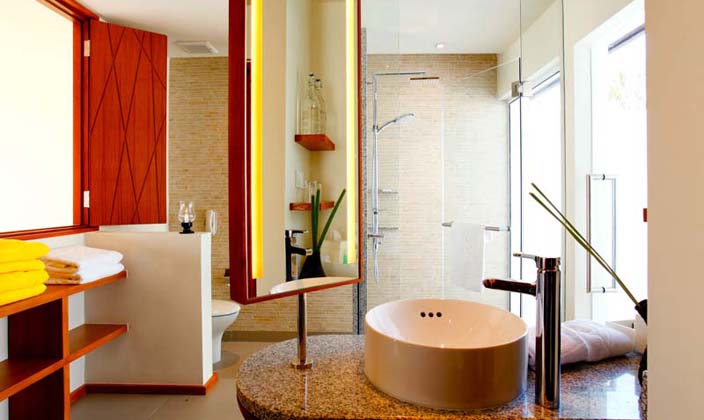 圣塔拉富士島上的頂級(jí)豪華溫泉水別墅提供一個(gè)帶家具的甲板,可直接進(jìn)入瀉湖,一個(gè)特大號(hào)床或兩張單人床的選項(xiàng),帶淋浴的浴室。