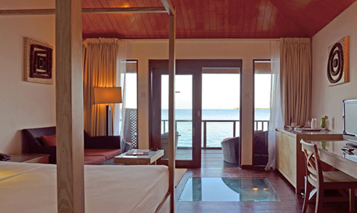 艾布度度假村水上屋也主打自然舒適的風格,房間清新不做作,會給游客賓至如歸的感覺。水屋有玻璃地板,方便欣賞海底的生物以及色彩斑斕的珊瑚,但是不建議兒童居住。