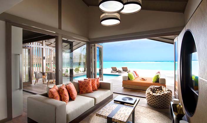別墅可以俯瞰碧綠的瀉湖和馬爾代夫的純白色沙灘。該別墅擁有自己的私人游泳池和露臺,可直接進入瀉湖。傍晚的夕陽將瀉湖照成粉紅色,紅色和琥珀色的色調。