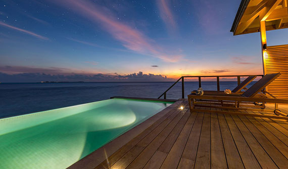 全島共有15間海洋泳池別墅和15間日落海洋泳池別墅,海洋泳池別墅朝向日出方向,日落海洋泳池,別墅可以欣賞到美麗的馬爾代夫日落美景,帶私人無邊泳池。