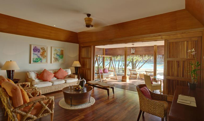 建于瀉湖之上的獨(dú)立位置,有四柱大床,大座位區(qū)和陽(yáng)光浴甲板,室外淋浴設(shè)施,加大浴缸,可觀賞到海洋風(fēng)景。