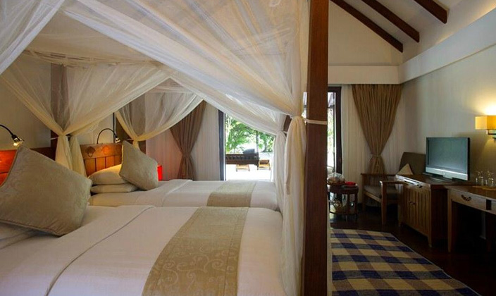 這是一種連體雙間別墅,房間內提供一間大床房和一間雙床房,室外淋浴設施,私人室外走廊,馬爾代夫式的秋千,陽光休閑區。