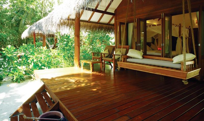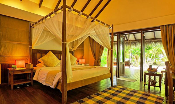 分散在島嶼上,面對海灘,四柱大床或雙人床,室外淋浴,私人室外走廊,陽光休閑區,馬爾代夫式的秋千。