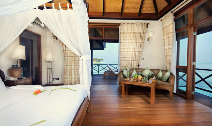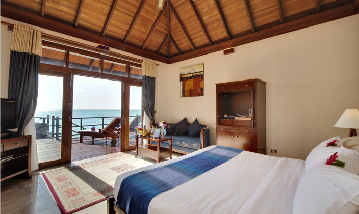 一棟客房有上下兩層共4個套房,都是面海而建,有露天陽臺。陽臺離海很近,站在陽臺上就可以俯視珊瑚海灘和瀉湖的美景。房中有起居室和寬敞的衛浴室,還包括舒適大床、沙發和衛星電視等。