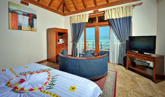 總統水上別墅可提供無障礙的遼闊視野和完全的私密空間。套房融合了現代設計和傳統馬爾代夫式建筑風格。房中有兩間臥室,屋外是雙層式柚木陽臺,第一層陽臺設有私人泳池和露天按摩浴池,第二層陽臺上有可供直接下海浮潛的樓梯。