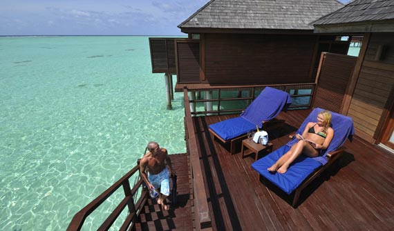 豪華水上別墅位于島嶼向海中延伸區域,每間房均設有向外延伸的陽臺,陽臺上有休閑躺椅,可進行日光浴。此外,還有一個上浮平臺,該平臺有一專用的樓梯延伸入海中,可由此進行浮潛觀魚。