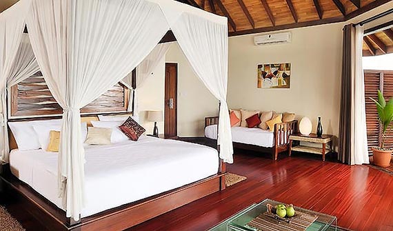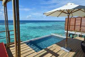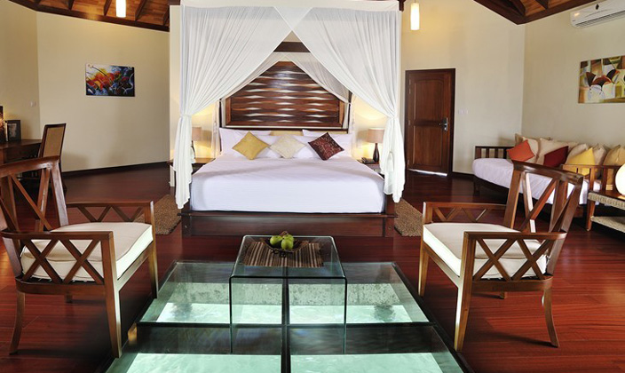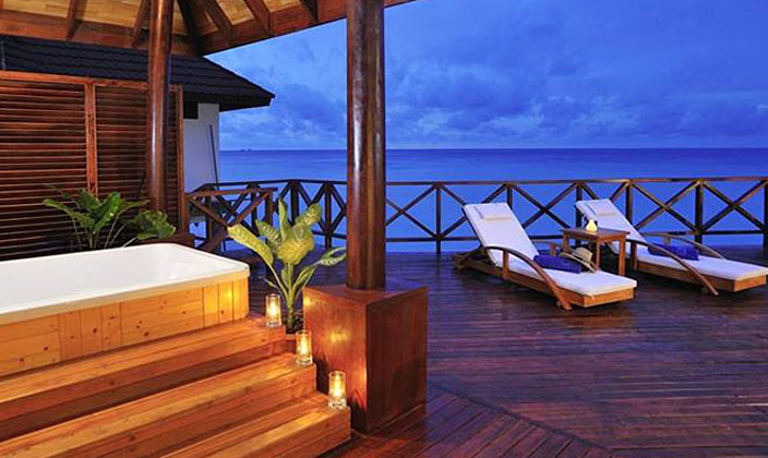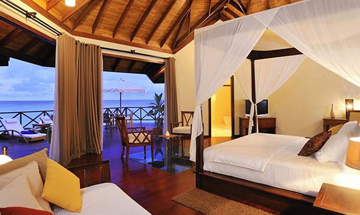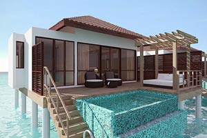 客人可以在房間內享受360度全景島嶼風光和被海洋而圍繞的美感。開闊的空間以及更加豪華設計與設施,讓客人充分的體會到最尊貴的享受。房間有兩個套間的臥室,獨立的生活區,增強了私密感。一個私人泳池和有按摩浴缸的私人甲板,兩個四柱床,帶來更加自在的享受。