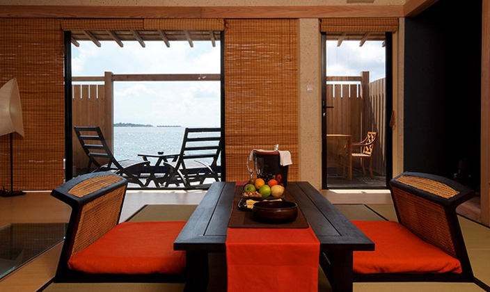 水上日式別墅以傳統日本建筑為設計理念,以追求奢華、隱秘住所的賓客需求為標準精心構建而成。室內裝潢的色調能夠舒緩情緒,美觀宜人,家具的位置經過精心擺設,散發出原汁原味的日本情調?;胍患珴甚r艷的和服,想像自己穿越到了古代日本居住沖繩海岸的傳統民家。擁有寬敞走廊的日式別墅棲于瓦度島綠松石般的水域上。