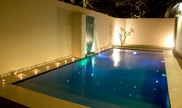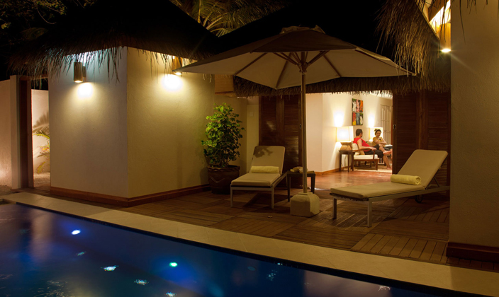 泳池別墅套房位于泄湖水面上,包括兩個獨立的雙人臥室,一個客廳和一個共享的私人游泳池,臥室提供一個寬敞的浴室。走進別墅的私人花園即可看到一個單獨的大型開放式淋浴的海灘別墅。該房型非常適合家庭出游。