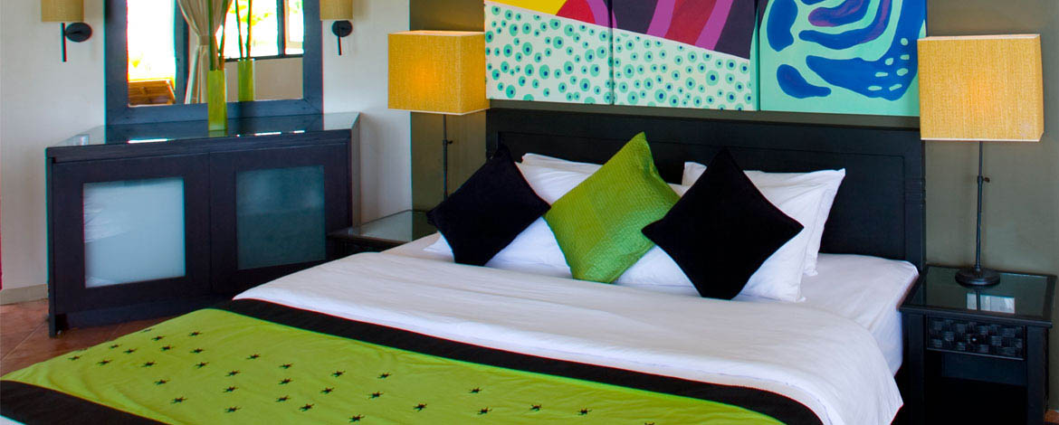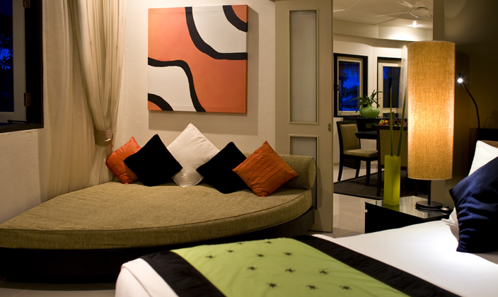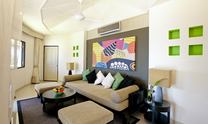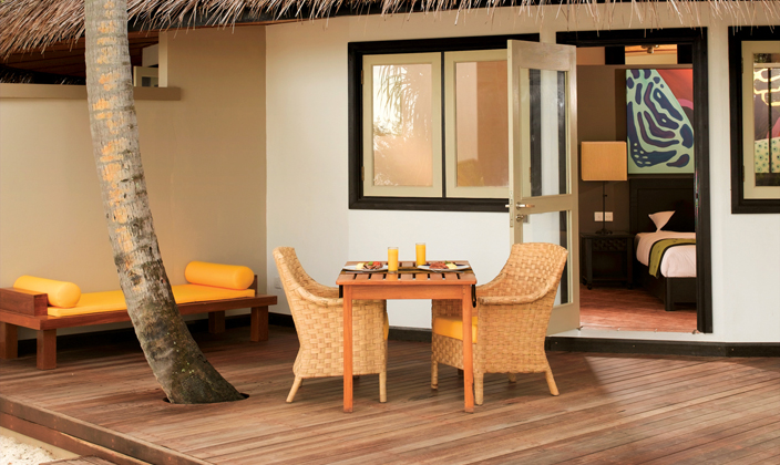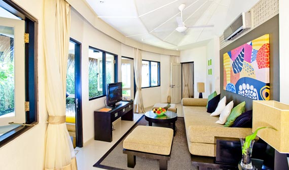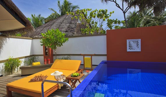 在您的別墅后院中打造一處舒適的角落,更有專享泳池和按摩浴缸等您前來體驗。 別墅內(nèi)部裝飾采用對比強(qiáng)烈的濃艷色彩,為您的別墅內(nèi)馬爾代夫體驗注入歡樂與活力。 臥室角落處設(shè)有一張沙發(fā)床,您可以在窗下安坐或愜意地做個美夢,獨立的起居區(qū)采用多種對比鮮明的顏色裝飾,明亮絢爛,兩側(cè)環(huán)繞著玻璃大窗。