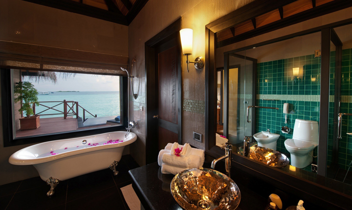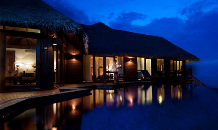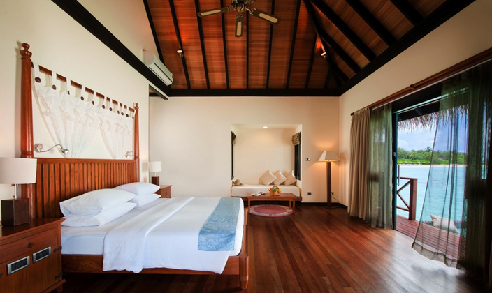 總統(tǒng)水上屋位于水上的2座木橋連接處的頂端,提供完全的私密休閑,水天連線,仿佛造訪了天堂的國(guó)度。屋內(nèi)設(shè)計(jì)結(jié)合歐式風(fēng)與傳統(tǒng)馬爾地夫的...查看更多
