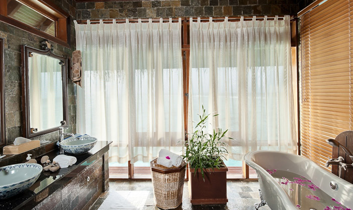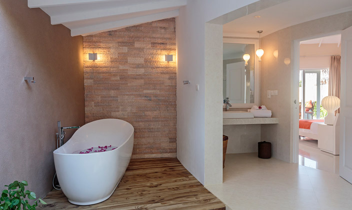 坐落在郁郁蔥蔥的植被之中,每個(gè)別墅擁有全景海景,可以俯瞰如畫海灘和瀉湖的風(fēng)景。全白色的室內(nèi)裝飾上了柔軟的熱帶色彩主題。橙色和粉紅色的閨房風(fēng)格沙一點(diǎn)神秘和浪漫。