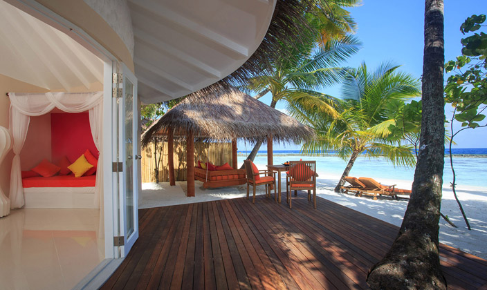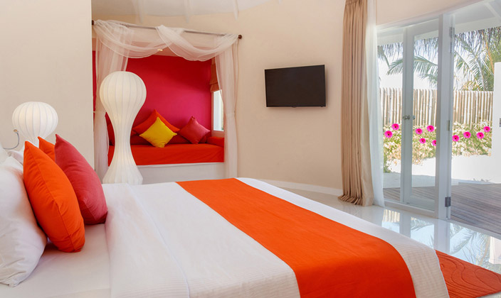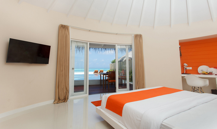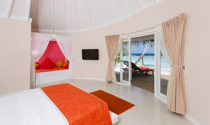 這個(gè)是一個(gè)新房型,從2015年2月開(kāi)始出售,房間比之前的沙屋更大,全白色的室內(nèi)裝飾上了柔軟的熱帶色彩主題。橙色和粉紅色為房間的主要風(fēng)格,增加了一點(diǎn)神秘和浪漫。全玻璃的推門,有私人陽(yáng)臺(tái)俯瞰海灘,出門就是瀉湖沙灘。