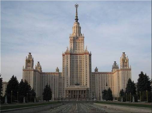 莫斯科大學建于1755年1月12日,俄羅斯最古老的大學。其舊校址在莫斯科市中心。1953年大學新主樓在麻雀山建成后,莫大即遷至麻雀山。這座主樓是莫斯科七座斯大林式建筑(號稱七姐妹)之一,斯大林式建筑是典型的中央集權式建筑,大底座、高尖頂,流露出強烈的“一元論”價值觀。主樓高240米,共39層,有三萬多房間,它集各種功能于一體,食堂、住宿、辦公、娛樂、禮堂、超市、郵局、銀行、書店、圖書室等等。