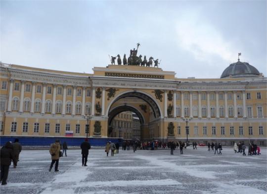 國(guó)家博物館。冬宮的四面各具特色,但內(nèi)部設(shè)計(jì)和裝飾風(fēng)格則嚴(yán)格統(tǒng)一。冬宮面向?qū)m殿廣場(chǎng),中央稍微突出,有三道拱形鐵門,入口處有阿特拉斯神巨像。