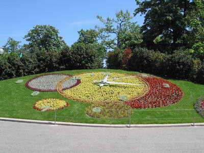 花鐘座落于萊蒙湖畔,是一種既能供人欣賞又能體現時鐘功能的設施。它的機械結構設置在地下,地面上的鐘面是由鮮嫩翠綠的芳草覆蓋,代表12小時的阿拉伯數字則由濃密火紅的花簇組成;有時候,鐘面開滿了艷麗的花朵,它的阿拉伯數字卻換成了平整的綠茵。它隨著季節變化而改變色彩,但總保持著鮮艷和芳香。