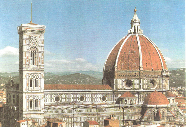 如果說,圣彼得建造過程中的麻煩,首先是信仰交鋒,以及伴隨著一連串傳奇般的人事糾葛的話,那么花之圣母教堂所遇到的難題則更多地存在于單純的技術(shù)方面,因為這個穹窿的建成比前者不僅要早出一百多年,跨度也略有過之,盡管建筑的總體高度稍有不敵。