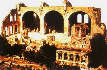 巴西利卡意思是長方形會堂。該建筑始建于公元306年—310年,由君土坦丁大帝于公元312年—337年完成,是古羅馬筒狀穹窿建筑的代表作,今尚存北邊三個巨大的穹窿。整個建筑平面呈矩形,穹窿及其支撐結構顯得莊重,具有紀念性,因此,這種巴西利卡也就成為后來基督教建筑的一種模式。