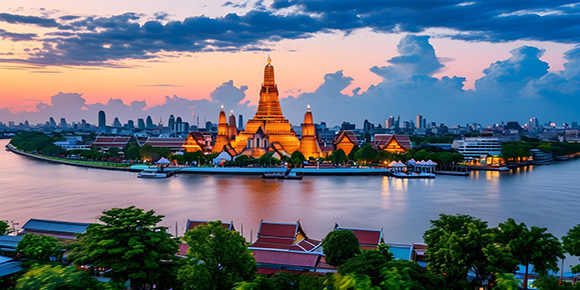 早餐之后我們開啟一段王室之旅。衣著整齊參觀泰國巍峨壯麗,金碧輝煌的大皇宮和玉佛寺(參觀約2小時),是王權和宗教融合的登峰造極之作,皇宮建筑風格美輪美奐,寶石鑲嵌鋪天蓋地,價值連城都不足以形容。乘船暢游湄南河-遠眺鄭王廟,鄭王廟(Wat Arun),又稱黎明寺(Temple of the Dawn),是紀念泰國第41代君王、民族英雄鄭昭的寺廟。始建于大城王朝,當時名皇冠寺,后改稱昌寺。后大理石寺參觀。前往大理石寺,它位于曼谷市北的阿育它亞路,又名“云石寺”,為拉瑪五世時所建。寺內建有佛殿、藏經閣、長廊、樓閣、佛學院等建筑。其主院建筑全部由意大利輸入的大理石建成。主殿大門兩側有石獅子守衛,殿內供有一尊高約3米的釋迦牟尼金佛。主佛殿中的清拉佛像,是泰國著名彭世洛佛像的復制品。主殿后面,是一個以云石鋪地的大庭院,陳列著51尊泰國歷代各時期的各種類型的佛像,融合了中印等佛教造型藝術風格,是19世紀泰國佛教的典范。此外,還有中國或日本的佛像。隨后我們來到臥佛寺(約1小時)臥佛寺內臥佛為世界最大臥佛,長46米,高15米,每只腳的腳底便長達5米,上刻有108個佛像圖案。佛臥之姿態,在表達佛陀追求涅槃時之姿態。其右手托頭,全身側臥,悠然于佛壇之上,殿堂四壁以描寫佛祖生平的巨型壁畫相伴。之后送往曼谷唐人街(chinatown),自行游覽中華老傳統街景,同時體驗唐人街的特色美食小吃。隨后回酒店休息。