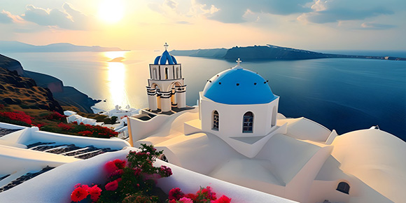 乘船前往圣托里尼島,圣托里尼島是一個充滿愛琴海古文明及浪漫美景的島嶼。抵達后,前往該島最西端的火山斷崖伊亞,捕捉該島嶼最經典的白色小教堂映襯藍色愛琴海的唯美景致和最浪漫的“夕陽日落愛琴海”;(由于要去欣賞日落,所以此天晚餐為希臘肉卷簡餐+每人一瓶水)