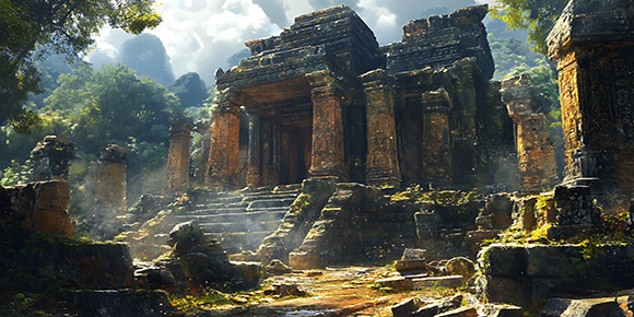 【崩密列(Beng Mealea)】:建于12世紀的蘇利耶跋摩二世(Suryavaman Ⅱ)朝代,它是吳哥遺跡群中最值得去同時也是最難前往的遺跡。崩密列的護城河長1.2公里,寬0.9公里,它和吳哥寺幾乎一樣大的規模,但依然被叢林嚴密包裹著。由于比較荒僻,所以很多浮雕和塑像已被掠奪,但寺廟的神秘氣氛仍舊在森林深處彌漫。與已修繕過的小吳哥相比,它并未被恢復原貌,仍保持著被發現時的模樣。