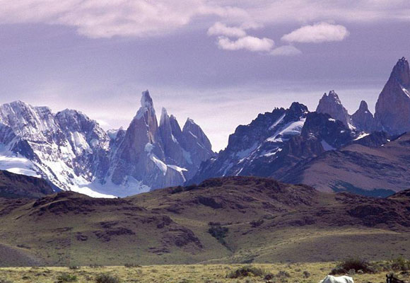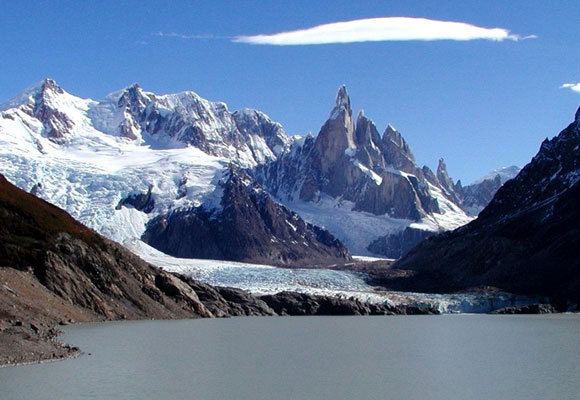 雖然現在是夏季,可遠處高山上仍然白雪皚皚,終日被霧氣環繞。融化的雪水從山上流下來,形成了許多小河,滋養著山腳下一叢叢低矮的松樹和五顏六色的野花。我們的旅行車就穿行在這綠樹花海之中,倒也不乏詩意。進了公園后,一車人在導游的帶領下,徒步穿越低矮的灌木林,向冰河進發。這是我第一次近距離觀賞帕塔格尼亞的植被,這里到處都是以前從沒見過的長相奇異的花草,北半球的植物學家來到這里肯定會高興得發瘋。就在我一邊欣賞著無名的野花,一邊爬上一座山坡的時候,夢想中的冰河突然悄無聲息地出現在眼前,白茫茫的一片浮冰讓我感到似乎有一股冷氣迎面撲來。爬到山頂仔細一看,在寬達一公里的江面上豎立著一道白色的冰墻,與墨綠色的河水無聲地對峙著。冰墻高達60余米,俯視著毫無波瀾的江水,似乎在這場對峙中占了上風。無數細碎的冰塊散落在江面上,靜止不動。走近再看,我發現冰墻的表面到處都是坑坑洼洼的溝壑,冰縫中竟然透出藍色的光芒。爬到高處再一看,我發現這冰墻后面是聯綿不斷的冰山,夾雜在綠色的山峰之間向遠處伸展開去。冰面上霧氣繚繞,一座座圓錐型的尖峰隱藏在霧氣之中,好似藏有千軍萬馬。導游介紹說,Perito Moreno國家公園的這條冰河面積比整個布宜諾斯艾利斯還要大,而整個帕塔格尼亞的冰河總面積竟然高達17000平方公里之多!不管周圍環境溫度有多高,冰河上方的溫度總是很低。很多部分年降雪量高達30余米,這股天降之力促使冰河以每天2米的速度向陸地移動。我們所在的地方正是冰河與陸地的交匯之處,表面上看是冰墻與河水的對峙,可實際上真正的交戰發生在水下,是冰河與陸地硬碰硬的戰斗!堅硬的冰斗不過更加堅實的土地,于是每隔一段時間就會有冰塊從冰墻上脫落,掉進水中,這就是那些飄浮在河水表面的冰塊的由來。