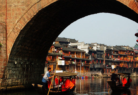 鳳凰古城有一條母親河,伴城而過,如黛似練,當(dāng)?shù)厝四匦藿ㄆ鹨环N叫做吊腳樓的獨(dú)特建筑逐河而居。吊腳樓一側(cè)臨水,一側(cè)倚岸。臨水一側(cè),以木支撐,是為“吊腳”。整棟小樓輕盈俊俏,樓臨水,水映樓,清晨黃昏,霞光如水水如煙,三五月圓之夜,景色更是怡人。這時(shí)鳳凰第一怪。有人問了,