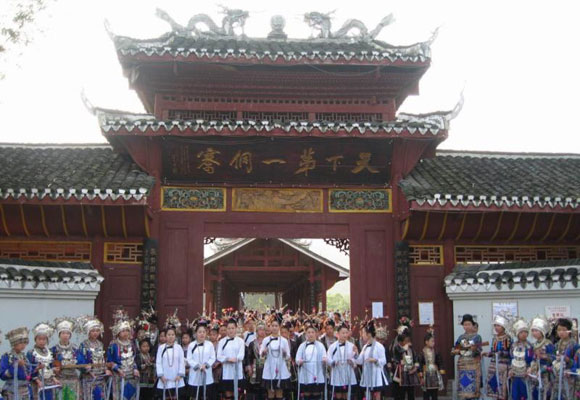 雷山到榕江的路還在修,我們計劃經雷山去榕江的計劃也不得不改成返回凱里,再坐5個小時的大巴終于到了榕江縣城,坐了一輛麻麻油(音,想來應該是慢慢游的意思)不遠就到了車江。據說車江目前是唯一一個收費進入的侗寨,除了榕樹群和郎珠娘美的美麗傳說外,還有黔東南最漂亮的鼓樓,而矗立在公路邊的上書“天下第一侗寨”的牌坊顯得有些氣勢逼人。