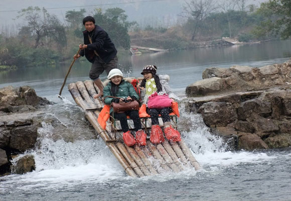 開始就一個浪頭打過來,我和驢友用竹竿撐著筏子左躲右閃,好容易避開浪頭又迎來一堆碎石群,水淺,但更加湍急,我們還來不及尋找支撐點就被水流沖向前去,緊接著浪疊著浪,濕遍全身再濕一遍。刺激,快哉!玩水的妙處正在于此。漸漸地,水面趨于平緩,剛還想在突破水浪后能休息一下,但河水哪能放得過你。“嘩~~~嘩~~~”在我們眼前突然出現(xiàn)了一個水瀑,看樣子水差足有兩米。我們不敢放松一下,緊緊扒住皮筏,握緊竹竿,急速的河水不等我們準備過多,一下子就將我們沖了下去,連人帶筏全翻進水里,剎那間,我們感覺身體和靈魂仿佛在山水間上下翻飛,頭上的飛瀑與腳下的浪花交相輝映,構成了一個激情四射的水世界。翻到水里,我頓感緊張,但在全身上下?lián)渫ㄒ环蠓讲虐l(fā)現(xiàn)此處河水不過一米。扶著石塊,慢慢走近卡在石縫中間的皮筏,倒出皮筏里的水,重新?lián)纹痖L長的綠竹竿。