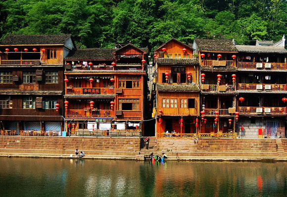 食宿在鳳凰:“清清的江水從城中流過,數只漁舟悠閑地停在江邊,岸邊垂柳依依,三兩苗女浣衣,幾個光屁股的兒童在水中嬉戲。青石板鋪就的潮濕的街道,四通八達,街道兩旁那古式木結構的房屋,一間挨著一間,錯落有致,面河一側的房屋一個連著一個,從堤