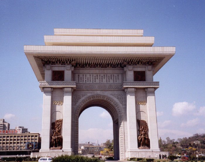 朝鮮凱旋門位于首都平壤牡丹峰山腳下的凱旋廣場,建于1982年,是一座紀念碑式的建筑。凱旋門高60米(比巴黎的凱旋門高10米),寬52.5米,整座建筑用1.05萬多塊精雕細琢的高級花崗石砌成,規模宏大。拱門是朝鮮傳統的城門形式,高27米,寬18米,可同時開行幾輛汽車。