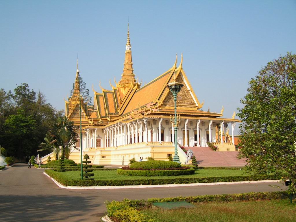 皇宮也稱四臂灣大王宮,因位于上湄公河、洞里薩河、下湄公河與巴薩河的交匯處而得名,是諾羅敦國王于1866-1870年建造的,由柬埔寨的頂尖建筑師所設(shè)計,是柬埔寨現(xiàn)任國王西哈努克的皇宮。是一座富麗堂皇的建筑群,外有黃墻圍繞,內(nèi)有金殿、銀宮、查雅殿等20多座大小宮殿。王宮為長方形,長435米,寬402米,外有城墻。王宮的建筑具有高棉傳統(tǒng)建筑風格和宗教色彩,宮殿均有尖塔,代表繁榮;殿身涂以黃、白兩色,黃色代表佛教,白色代表婆羅門教。王宮最初為木結(jié)構(gòu),后改建為水泥結(jié)構(gòu),但保持了原來的風貌。王宮周圍回廊的壁畫,是40位藝術(shù)家精心繪制的印度神話故事。