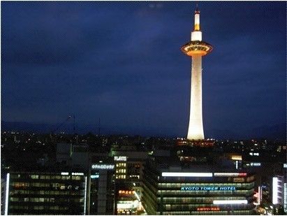 矗立在京都站前的京都塔建于1964年,高131米,呈蠟燭狀,是眺望京都的好場所。不采用鋼骨架方式,改采鋼鐵環堆積方式建成。京都的街道風貌一覽無遺,四周神社寺廟以及東山36峰盡收眼底。現在,京都塔已經成為京都大門口的象征性建筑,從這里眺望京都的夜景,別有一番情趣。