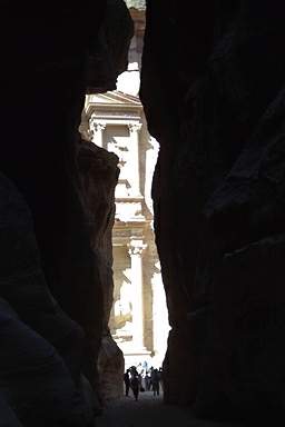 蛇道(塞格小道)是佩特拉的門戶,實際上是一條長1公里、高達近百米的巖石裂縫。走在其中,令人不能不驚嘆大自然的鬼斧神工,同時羨慕佩特拉人的好運,竟然可以找到這樣一個天然的庇護所。在那霸田人和羅馬時期,小道曾經熱鬧非凡,來往的商旅都把佩特拉作為中途休息和貿易的地點。小道時寬時窄,曾經平整的石砌路面現(xiàn)在布滿礫石,崎嶇不平,只留下部分殘段,兩側筆直的峭壁幾乎在頭頂碰在一起,現(xiàn)在的小道幽暗寂靜,不復昔日繁華。在兩側石壁上有兩條水槽的遺跡,有的地方還殘留著陶制水管,那霸田人將山外的摩西泉水通過水槽引到“宮殿墓室”上方的儲水池里,可貯存2500立方米,供佩特拉城中居民飲用。