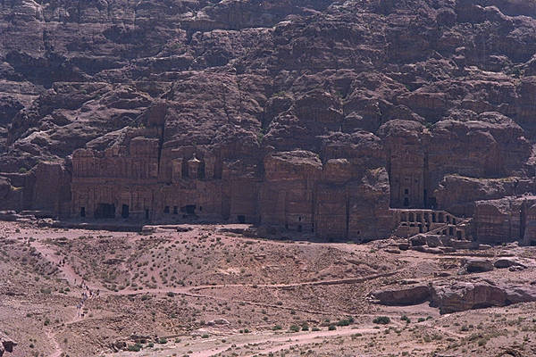 佩特拉古城里約有七百多個墓冢,而最著名的,要算是皇家墓冢群了,其中規模最大的是厄恩墓室UrnTomb,墓室內呈正方形,高18米,長寬各20米,在其中說話,回聲隆隆不絕。羅馬人占領時期,下面增建了拱形建筑,設立了司法人員的辦公室和監獄,當時是羅馬帝國佩特拉行政區最高的司法機構所在地,所以后人稱此地為“法院”。公元446年,又改為東正教堂。從厄恩墓室順勢向右,是皇族墓室、科林斯式墓室、宮殿墓室和六瓣花墓室。這五座沿山鑿成的墓室是那霸田王國幾代國王和皇族的墓室,它居高臨下、宏偉壯觀,體現了國王至高無上的權力。